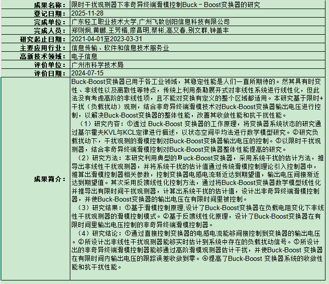 根据国家《科技成果登记办法》有关规定,现将我单位《限时干扰观测器下非奇异终端滑模控制Buck-Boost变换器的研究》成果登记相关信息予以公示。