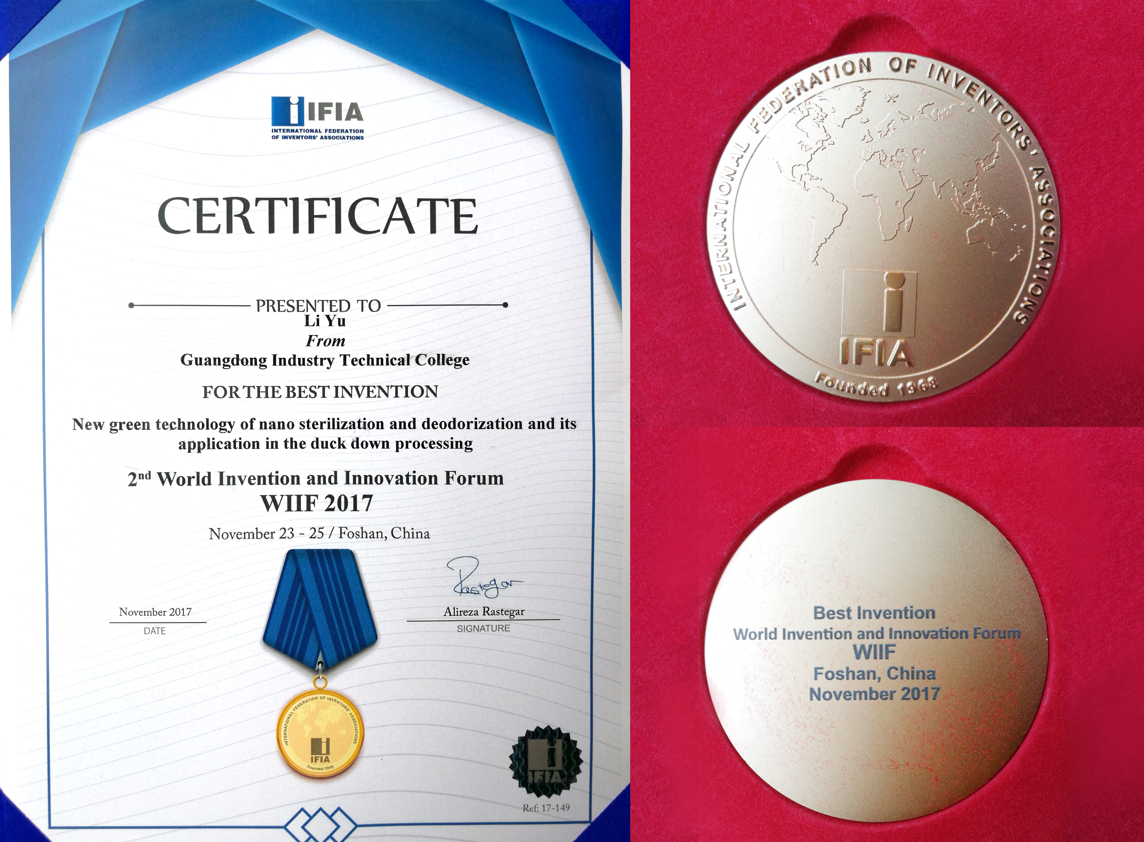 我校黎彧教授的《纳米绿色杀菌除臭新工艺及其在高档羽绒加工中应用》荣获金奖和由发明者协会国际联合会(IFIA)设立的最佳发明奖;轻化工技术学院向华博士的项目《一种荧光材料所制凹版表印荧光防伪油墨》荣获铜奖。