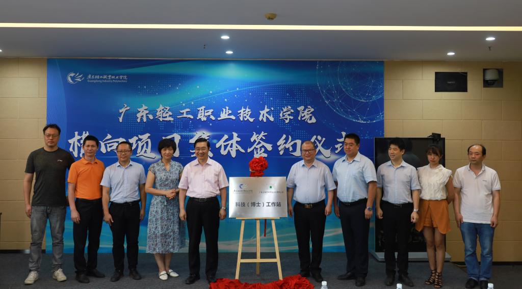 同时,学校与广东三向智能科技股份有限公司在“智能统考系统开发”项目合作的基础上,成立了“科技(博士)工作站”并揭牌;与广州天芝丽生物科技有限公司合作成立了“广轻-天芝丽化妆品创新研发中心”并揭牌。